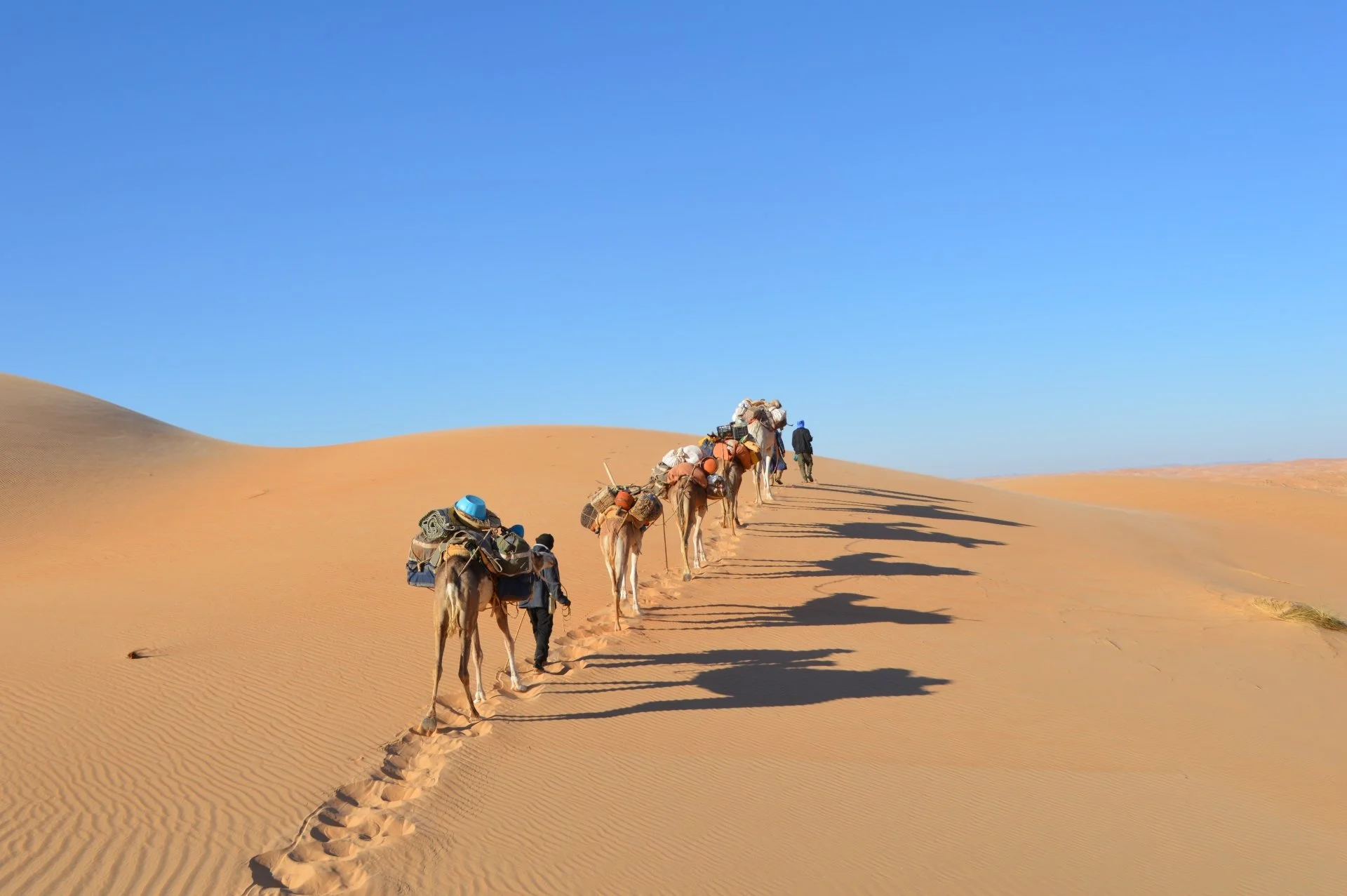 Am Morgen erkunden wir die Altstadt von Chinguetti mit ihren traditionellen Steinhäusern (12. Jh.) und der berühmten Bibliothek. Anschliessend starten wir unsere erste Wüstenwanderung Richtung Süden – hinein in die majestätischen Dünen des Erg Ouarane. Übernachtung im Zelt.